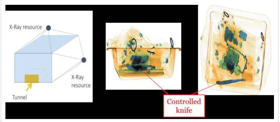 其实这是同一个包的两个不同视角的X 射线透视图像,你要是只看左边那个视角的话,这个刀就检测不出来了,可能被恐怖分子带上交通工具,伤害其他人。