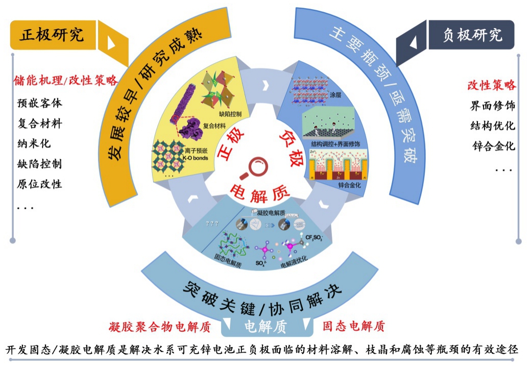 水系可充锌电池的发展还需要进一步系统的科学研究,对新型正极、负极材料和电解质的持续探索和优化具有重要意义。重要的是,开发新型凝胶/固态电解质可以有效降低活性水对电池体系的影响,是解决水系可充锌电池的正极溶解、锌腐蚀、钝化和枝晶生长的一种有效的途径,并能够更好地推动水系可充锌电池在柔性和可穿戴设备中的应用。