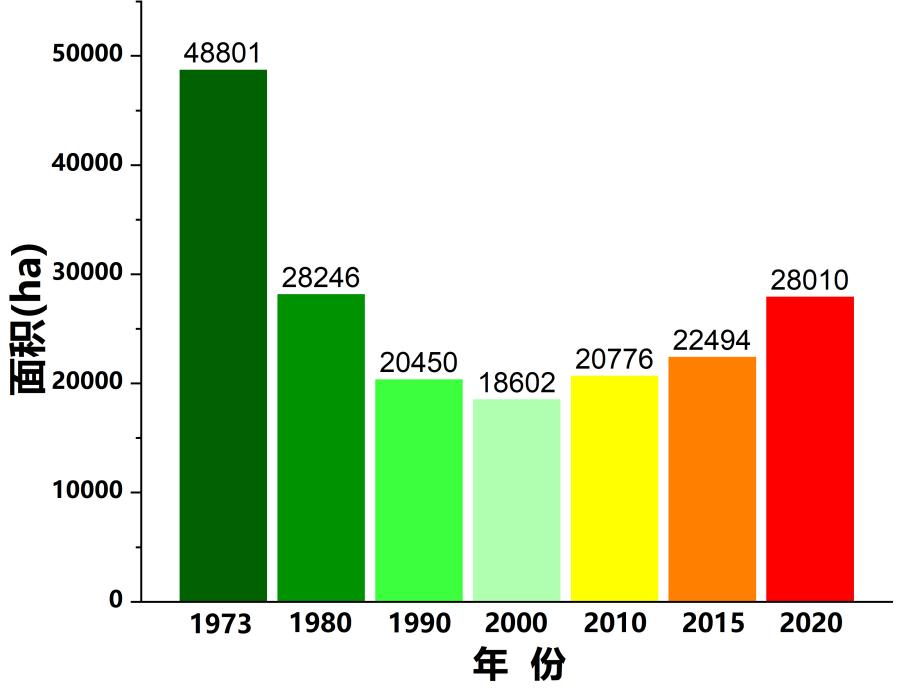 分析表明,近50年,中国红树林面积先减少后增加(见下图)。其中1973~2000年中国红树林减少了30199公顷,约62%的红树林消失;2000~2020年红树林面积增加9408公顷,增长51%。2020年,中国红树林总面积基本恢复到1980年水平。
