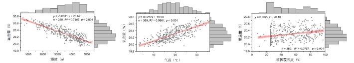 青藏高原近地表氧含量的变化还受到气温和植被覆盖度的正影响,气温每上升10 ℃,氧含量上升约0.21%;每增加10%的植被覆盖度,氧含量增加约0.02%(见下图)。