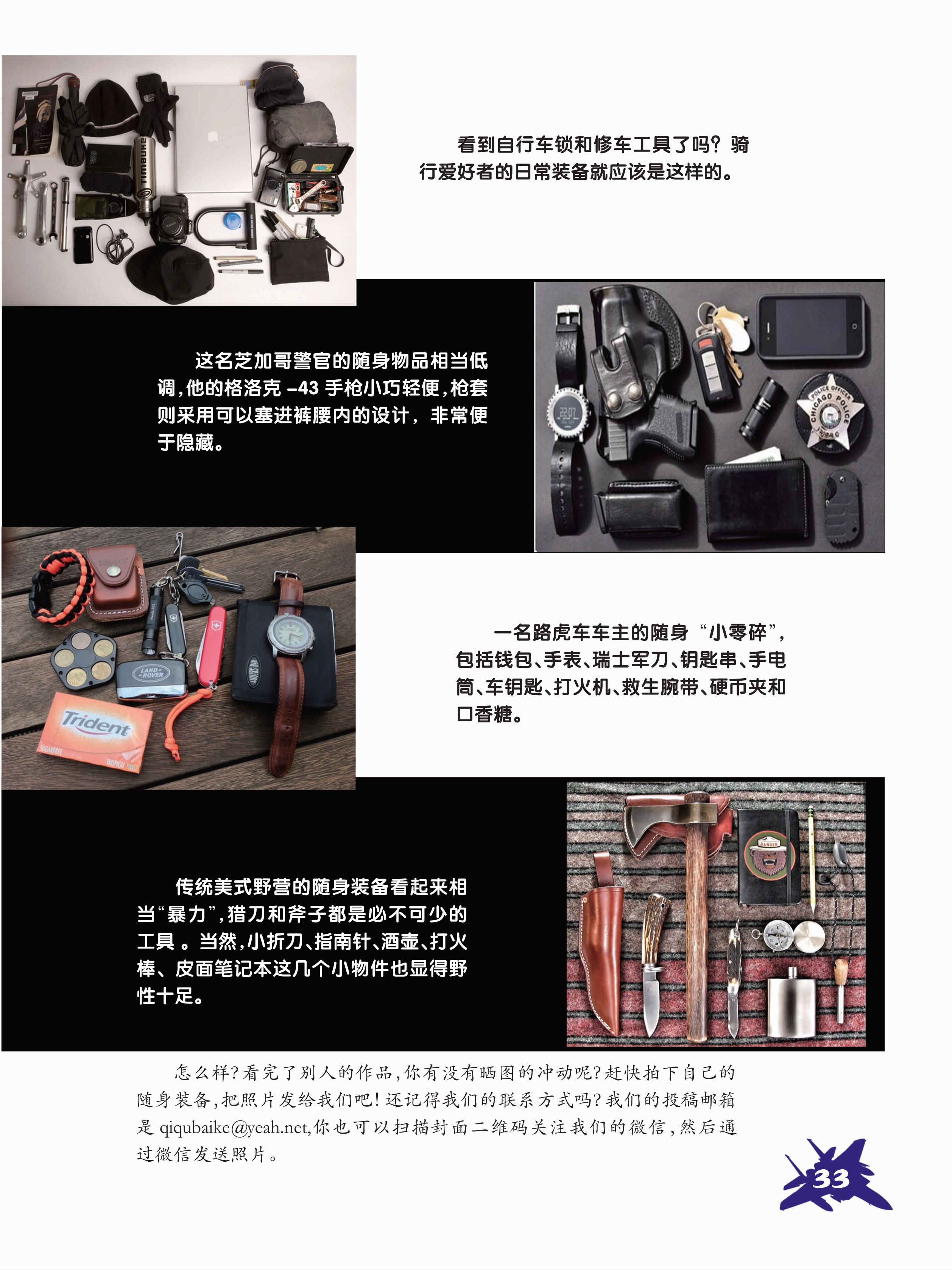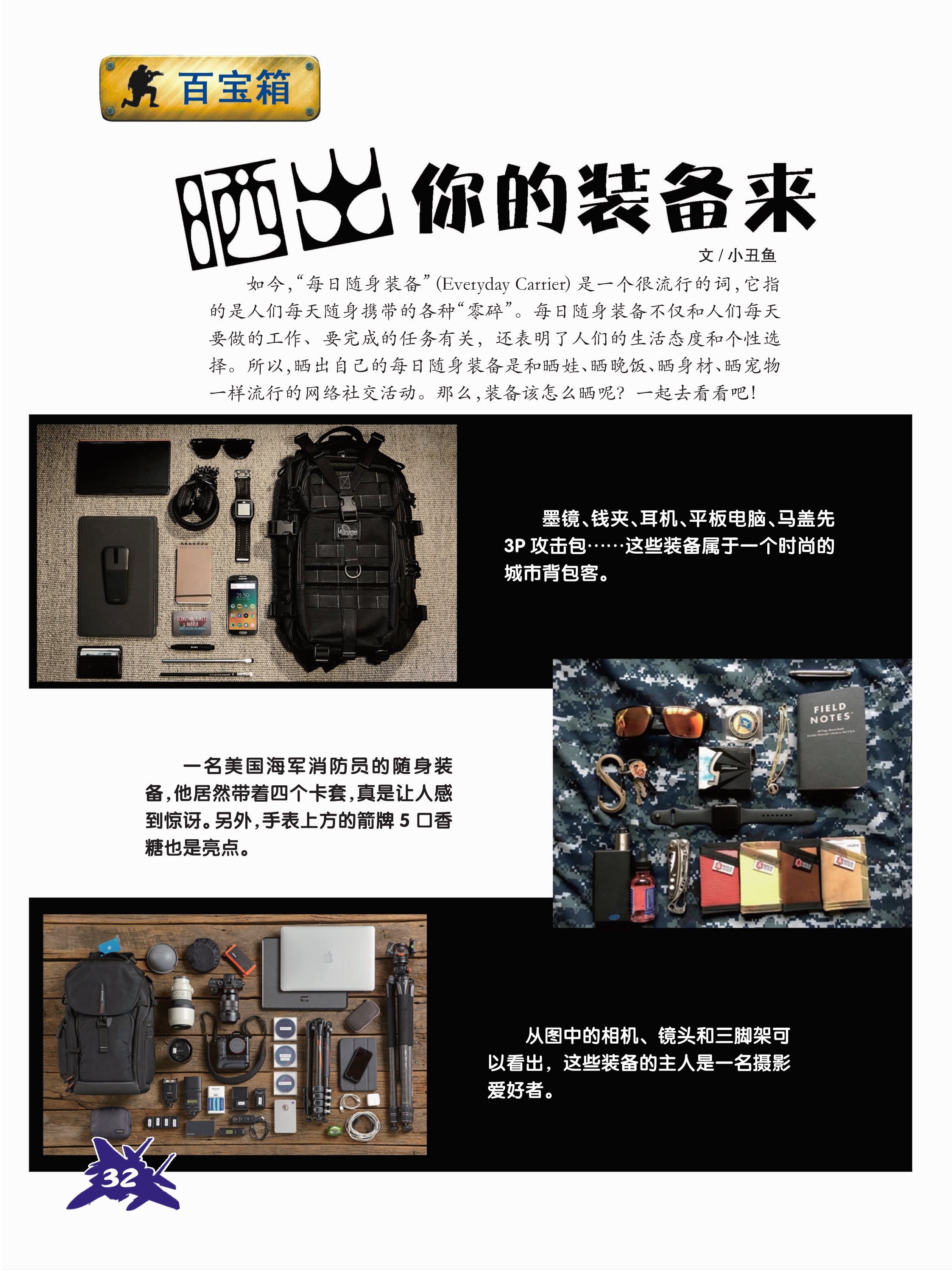 如今, “每日随身装备”(Everyday Carrier)是一个很流行的词,它指的是人们每天随身携带的各种“零碎”。 每日随身装备不仅和人们每天要做的工作、 要完成的任务有关, 还表明了人们的生活态度和个性选择。 所以,晒出自己的每日随身装备是和晒娃、晒晚饭、晒身材、晒宠物 一样流行的网络社交活动。 那么,装备该怎么晒呢? 一起去看看吧!