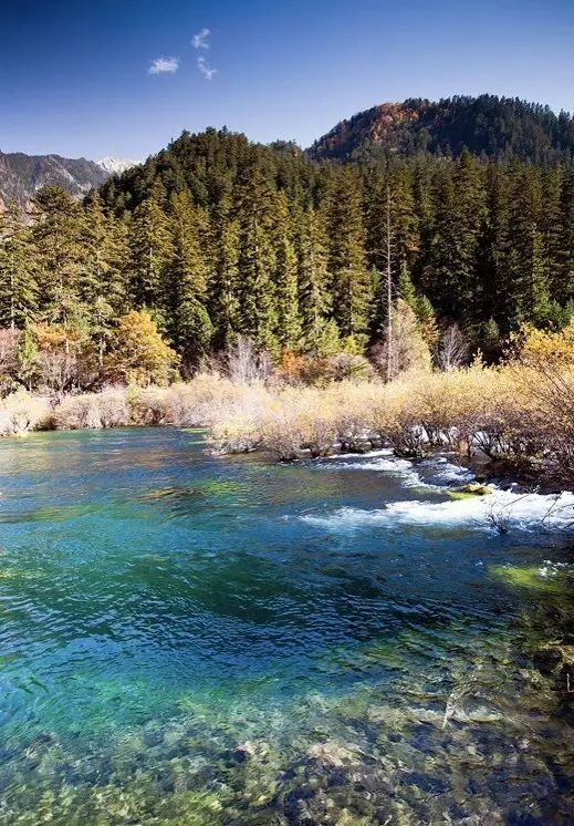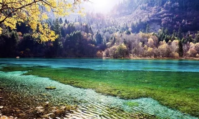 而绚丽斑澜的五花海是九寨沟的骄傲,“此景只应天上有,人间难得几回见”,五花海同一水域呈现不同颜色,大胆、强烈、富于变幻。五花海湖水北流出口,湖面缩小,形成了孔雀河道,平静安详的心情,在阳光的照耀下,碧蓝的湖水与岸边古树、野花相映,荡起五光十色的涟漪,宛如五彩的绫罗。