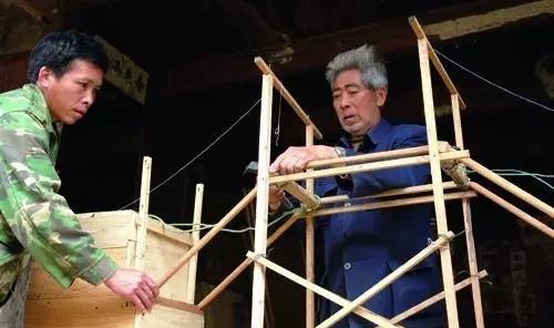 ▲国家级传承人董直机在木拱桥模型上演示传统木拱桥建造过程 摄影/季海波