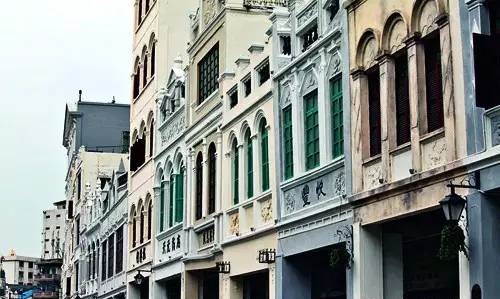 店屋层高一般为2—3层,个别的4层。楼层一般为4米左右,特别宽敞的约5米。功能布局为“前店后居”或“下店上居” ,并备有相当面积的仓库。面阔一般约4—5米,个别特窄的约2— 3米,特宽的约6米。但进深很大,除个别之外,一般都在20—30米以上,闽、粤地区称之为“毛竹筒”或“竹筒屋” 。临街的南洋风的巴洛克山墙千姿百态,构成了街廓的主要特色。