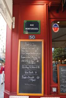 蒙特格尤大街(Rue Montorgueil)是巴黎中心区夏特莱(Châtelet)附近很有风情的小街,从哈勒斯市集(Forum des Halles)向北延伸的路上,林立着精巧的餐馆和咖啡馆,巴黎人喜欢沿街而坐,但凡腾挪的出方寸的面积店家都会不遗余力的码出桌椅,而且椅子不是相对放置而是直面街道,很有趣的意味,食客们既是观者又是被观者,也许只是为这么坐着,没有目的的看着眼前往来的人,车,狗和时间。