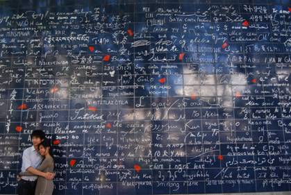 人们口中的爱墙是位于蒙马特高地半山腰上一个街头小公园里一面由511块深蓝色长方形瓷砖组成的墙。上面用311种语言和笔记写满了同一句话“我爱你”。和布拉格的那面“爱墙”不同的是,在这里并不是前来这里的爱人们用书写来表达爱,而是法国一位专门写爱情歌曲的音乐家巴隆以这种方式为不同民族,使用不同语言的人提供了一个相聚与和谐相处的地方。他搜集了300多种语言书写的“我爱你”,请一位法国女设计家设计了爱墙。无论倡议者的本意和设计形式如何,这里已经成为了情侣们的胜地。