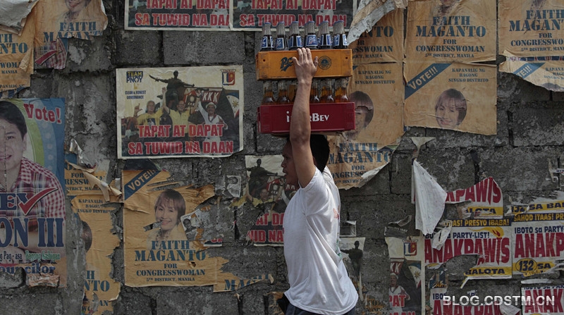 2013年5月12日,马尼拉街头,一名男子顶着饮料箱经过墙壁上张贴的竞选海报。菲律宾于5月中旬开始全国范围内的中期选举,人们将投票选出上到国会议员下到地方官员的各级别官员。