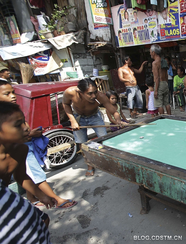 位于马尼拉一个贫民社区里,人们在打一种菲律宾独有的“撞球游戏”,桌台上放着的不是台球,而是木盘。这种游戏是很多菲律宾穷人的消遣方式。