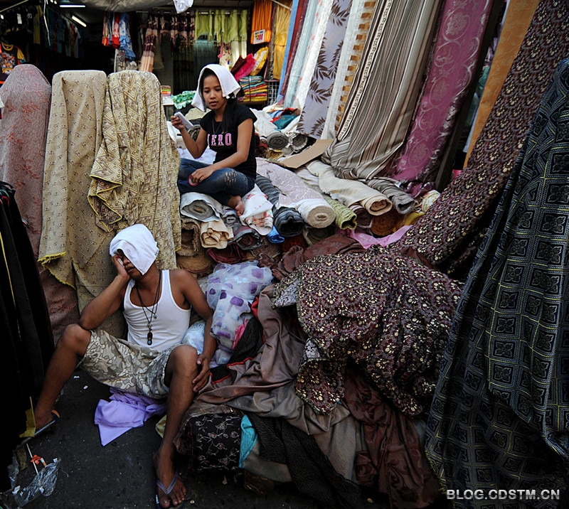 2013年2月,马尼拉Divisoria市场中一个售卖纺织品的摊位上,摊主蒙着头休息。