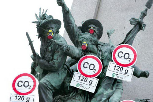 2008年6月5日,意大利罗马街头超过150个雕塑被环保主义者挂上反对排放二氧化碳的标语