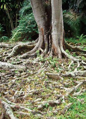 热带雨林专家们最终揭开了地面根的神秘面纱。他们说植物的根系在土壤中通常向深度和广度两个方向发展,吸收水分和养分的同时,也起到支撑植物地上部分的作用。身处热带雨林特殊环境的一些树种的根系受限于向深度发展,于是另辟蹊径采取了向地面空间发展的策略,印度榕则成为其中的典型代表之一。在数十年的生长过程中,印度榕的根系在地面层竭尽全力地呈辐射状延伸、扩张,从而缓慢形成了相互之间融合的网状地面根。这样,不但解决了植株头重脚轻的危机,也回避了常年水分饱和而易于导致呼吸困难的深层土壤,同时阻止了其他树种对其领地的入侵,最终构成了叹为观止的地面根现象。印度榕的“古灵精怪”以及大自然的神奇造化由此可见一斑。