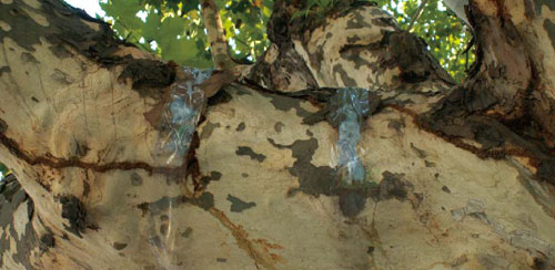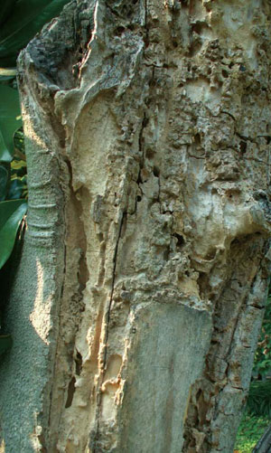 目前,南方许多省份大量的经济林、名木古树、行道树和绿化树木遭到了白蚁的严重危害。白蚁对树木的危害可以说是全方位的。有些品种的白蚁在活树和枯死树的树干内筑巢,能不同程度地危害城市绿化植物的枝干。这些白蚁的巢和群体都隐藏在树木枝干中,巢居由许多隧道相连而成,没有特定的形状。有些种类筑巢于干燥的木材内,靠空气和湿气就足以维持生命,如堆砂白蚁。有些种类则建巢于活树的枝中,如树白蚁、散白蚁,不筑外露蚁路,也不外出活动,取食和活动都在隐藏的通道中。