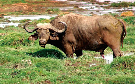 比亚洲水牛命运好得多的是非洲水牛,非洲水牛属仅此1种,5个亚种,由于亲缘关系与亚洲水牛相差较远,因而在分类学上享受特殊待遇。非洲水牛分布甚广,在非洲大陆的雨林和稀疏大草原上几乎都能见到它们的身姿。由于太常见,因此在美国国家地理频道或者英国BBC的野生动物纪录片中,我们经常能见到非洲水牛悠闲地漫步在辽阔的大草原中,可谓“明星动物”。非洲水牛还是非洲生态系统的关键物种,是食肉动物——狮子、鬣狗、猎豹、豹等的猎物,它们的尸体也喂养了众多中小型食肉兽类以及大量食腐鸟类。