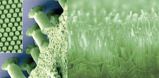 纳米仿生是目前纳米科学界最前沿的研究领域之一,近年来,科研人员试图用纳米材料来模拟壁虎脚,但都局限于光滑的物体表面,而且无法有效控制“强吸附”和“弱脱附”过程。最近,美国戴顿大学和佐治亚理工学院的科研人员用纳米材料研制出一种仿生壁虎脚,它们既能在垂直的表面上轻松吸附重物,也能从不同角度轻松取下,这使仿生壁虎脚朝着实际应用方向迈出了最关键的一步,在许多领域包括航空航天技术、电子封装和高温黏接等都显示出其巨大的应用前景。