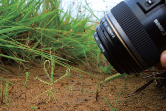 我们也学着达尔文的样子,趴在地上,用手指轻触茅膏菜叶片上的“水珠”。这些液体既是茅膏菜吸引虫子的诱饵,同时又兼备“消化”的功能,液体中含有的酸和蛋白酶,不仅能够将昆虫消化,对于人类也并不友善。相传,曾有植物工作者为了赶路,将采集的茅膏菜标本装进裤子口袋中,结果腿部皮肤遭到了腐蚀。为了体验消化液的效果,我以手指触碰那些液体——非常紧张,结果安然无恙。看来消化液的腐蚀能力不像我想象的那么强,还有就是接触的时间很短暂。