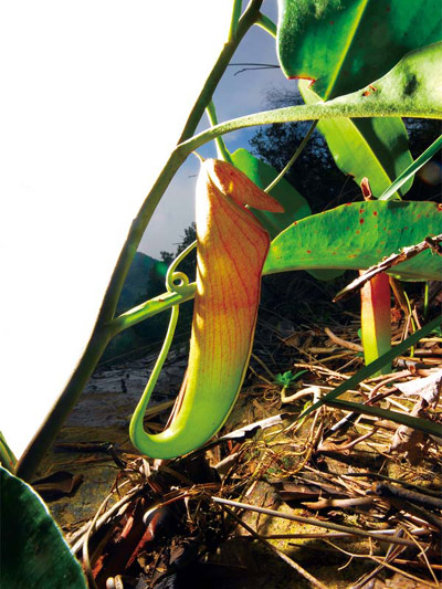 为了寻找捕虫笼上诱惑猎物的蜜腺,我在笼子的开口处仔细闻来闻去——没有甜味,所能闻到的气息,只有略带刺鼻的腐臭而已。臭气来源于笼子底部,浑浊的液体中,密密麻麻浸泡着虫子的尸体。丧生瓶底的虫子以蚂蚁为主,此外间或出现胡蜂、蟋蟀和蜘蛛。对虫子而言,捕虫笼无疑是一场恶梦,但就猪笼草而言,想必时常能够享用到营养丰富的美餐。在花卉市场或者植物园里,猪笼草的捕虫笼总是空空如也——相比于那些被人类栽培豢养的近亲,野生猪笼草的丰盛食谱显然值得羡慕。