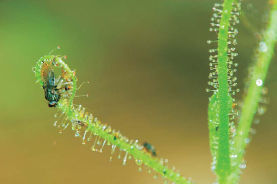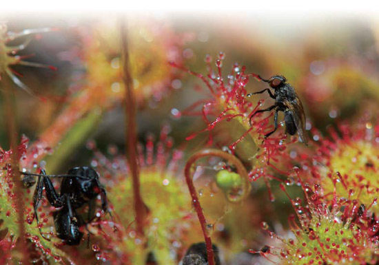 早在100多年之前,达尔文就曾潜心观察过茅膏菜的捕虫行为,并为之如醉如痴。他把切碎的鸡蛋放在茅膏菜叶片上当作“饲料”,用以观察和记录叶片对于蛋白质的反应,进而讨论这些矮小草本植物食虫的机制。相对于达尔文的全部著作而言,其间的《食虫植物》不过是单薄的一册,但其中多个章节的实验材料,都选用了茅膏菜。
