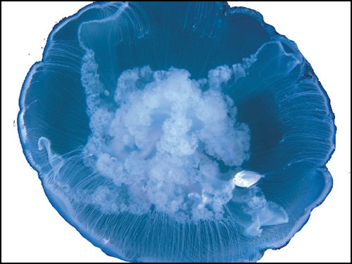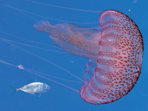 我们不得不去重新认识水母,审视自身。水母是一种低等的腔肠动物,浮动在水中,会向四周伸出长长的触手。水母在全世界有250种左右,直径从10厘米到100厘米之间,常见于各地的海洋中,大多没有经济价值。水母大量捕食浮游动物(浮游生物是漂浮在海洋中的小动物或植物的总称,它们不会游泳。浮游生物有两种:浮游植物和浮游动物,它们为处于食物链底层的小鱼、水母和其他动物提供食物),势必引起植食性浮游动物的减少,从而降低了浮游植物如藻类的被取食压力,最终引起藻类暴发和浮游生物群落结构的变化。藻类暴发引起水体的溶氧量降低,溶氧量的变化又将影响水母的数量及其群落结构的变化。赤潮也正是在这种背景下发生的。可见水母数量的增长,已经成为一种海洋生态灾难。