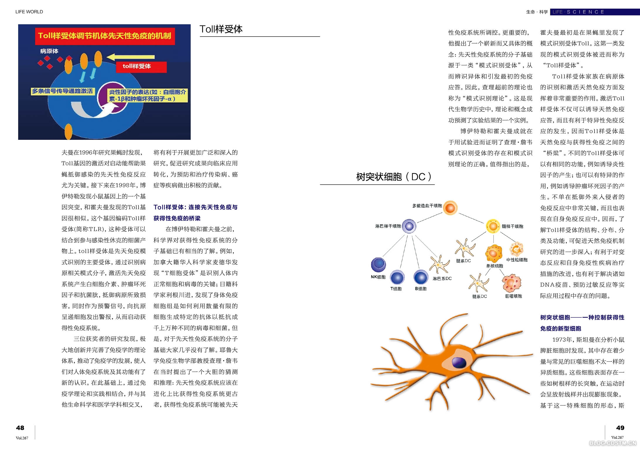 此外,树突状细胞参与了免疫耐受过程。当将抗原在体内直接运送给未成熟树突状细胞并消除树突状细胞的成熟信号后,机体可产生针对该抗原的免疫耐受,这项研究为器官移植和自身免疫性疾病的治疗带来了希望。虽然树突状细胞的发现和生理功能研究才3O多年的历史,但人们对这种特殊类型细胞已有了较为全面和深入的理解,相关临床应用也陆续展开。斯坦曼由于在树突状细胞发现及生理功能阐明方面的奠基性贡献而获得了大量的荣誉,成为免疫学领域的科学大师之一。■