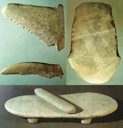 河南舞阳贾湖遗址中发现的石镰、石铲,以及石磨盘、石磨棒