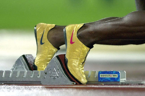 一个世纪前的百米短跑成绩平均每年提高0.015秒,如今已经减缓到每年提高0.006秒了。人们越来越注重从跑鞋上发掘点滴的潜力。根据测试,跑鞋重量每增加100克,运动员的体能消耗将增加1%。1991年东京田径世锦赛上,美国短跑名将刘易斯打破百米世界纪录时的跑鞋只有115克重;2000年悉尼奥运会上,“田坛阿甘”迈克尔·约翰逊的“金缕鞋”重量仅116克,玛丽安·琼斯的“水晶鞋”则只有99克;加拿大“黑豹”贝利的跑鞋被形容为“带钉的袜子”。人们不免生出疑问,为什么有些运动员竞赛中脖子上可以挂着沉甸甸的金项链,却对鞋子的重量如此锱铢必较呢?看看百米跑道上那些快速翻飞的双脚就会发现,每个运动员的后跟都几乎触及到了臀部,折叠起小腿能缩短以髋关节为轴的转动半径,从而减小转动惯量增加转动的角速度。而双脚处在小腿绕膝关节和髋关节旋转半径的最远端,因此鞋子重量些微的减轻,都会带来腿部转动惯量明显的减小。这对于以每秒20米速度交替划着弧线的双脚无疑是莫大的“减负”。