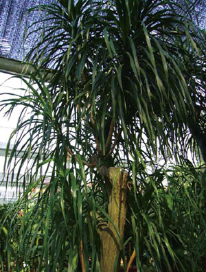 在我国云南南部,有一种生长缓慢而耐干旱的喜光树。此树树干粗短,树皮灰白纵裂,枝叶繁茂。这就是被誉为植物中的活化石的龙血树。它的树龄可达八千多年,是地球上最长寿的树。