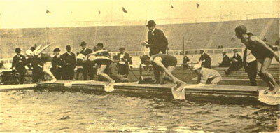 1900年巴黎奥运会的游泳同样在天然水体塞纳河上举行。这种原始的比赛环境显然无法反映运动员的真实成绩。海水的浮力大于淡水,而江河具有一定的流速。1908年伦敦奥运会,组织者在白城体育场中间挖了一个100米长的游泳池,虽然“水陆同场,游跑并肩”,但奥运会比赛总算第一次在人工游泳场进行了。