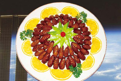 在4000多年前,我国先民就懂得利用野生的蚕茧抽丝,然后生产美丽的丝绸。至少在3000年前,野蚕被驯化家养,逐步成为具有经济性状的蚕种。我们知道,蚕吃桑叶,然后作茧成蛹。蚕吃入桑叶的量是蛹体积的10倍。在这个过程中,40%的桑叶被消化了,60%被排泄。同其他成分一样,蚕的排泄物可以多方面利用,包括养鱼、增加土壤肥力等。蚕在亚洲作为食品已经由来已久,人们把蚕蛹、蛾当作甜点吃。在日本,市场上还流行罐头蛹、罐头蛾等。科学家研究发现,蚕的蛋白质含量很高,5~6枚蚕蛹相当于1个鸡蛋的营养,以相同的重量计算,蚕蛹中蛋白质的含量远远高于鸡蛋;氨基酸含量也比猪肉、羊肉、鸡蛋、牛奶高数倍。蚕的生长周期短,仅需一个月左右。再加上蚕的生物转化效率高、活动所需空间小,饲养蚕的过程中气味小、不产生废水,因此,在狭小的空间基地养蚕的好处很多。专家估计,蚕有望成为长期生活在空间基地的航天员较理想的高营养食品。