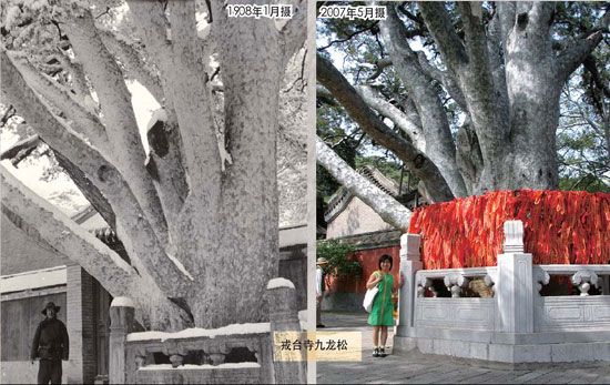 戒台寺坐落在可以俯瞰整个北京城的西山上,这座寺庙有着悠久的历史,甚至早于北京城建立。1908年冬季,1月17日,雪天,美国农业部和阿诺德植物园的植物采集人弗兰克·梅尔在戒台寺拍摄到一棵巨大的白皮松(Pinusbungeana)。据他的描述,这棵白皮松大约有1200年的历史,与这座寺庙年纪相仿。这棵树胸径6.3米,生长着九条结实的枝干。我们能在照片上看到,这棵树的前方有一座石门,后面坐落着一个建筑物。