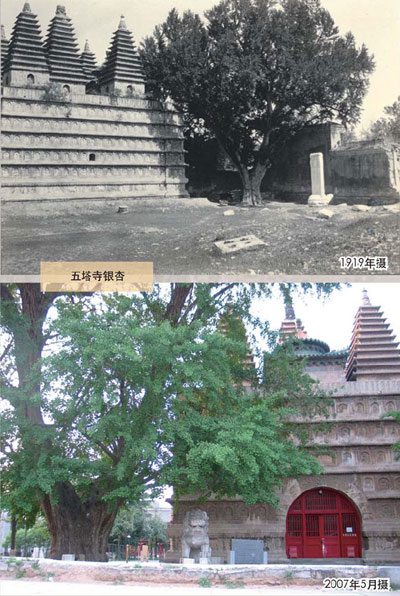 生长于寺庙左侧入口前方的这棵银杏树今天依然存活着,大约有27米高,6米粗。这棵充满健康活力的树果实累累。我们换了一个角度拍摄,因为1919年拍摄照片的角度被后种植的灌木和小树挡住了。