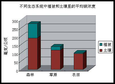 不同生态系统中植被和土壤里的平均碳浓度。从中可以看出,森林生态系统的碳储存能力最强