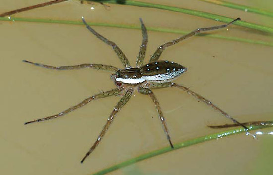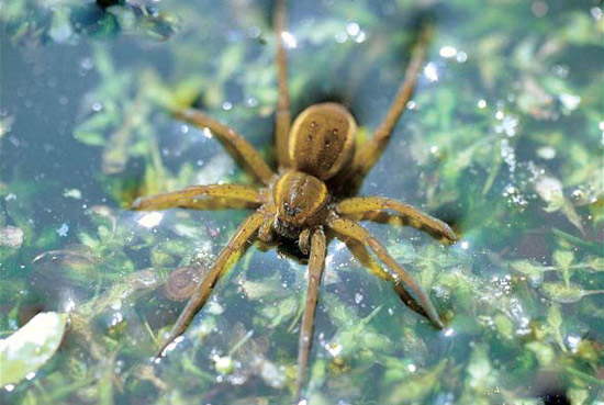 和水黾具有类似本领的还有捕鱼蛛,捕鱼蛛不仅可以生活在陆地上,也可以在水下捉鱼,可谓武艺超群。如果幸运的话,你可以在水边欣赏到它们精湛的表演。首先是潜伏,捕鱼蛛用后腿抓住植物茎杆,其余腿和触肢轻轻拍打水面,耐心地等待猎物。嘘,猎物来了,捕鱼蛛从一个水面移到另一个水面,一只小昆虫霎时就遭殃了。