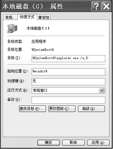 步骤二:单击[快捷方式],将“目标”栏内的代码中的“G”改成你想要打开的磁盘,也可以直接指向你要打开的文件夹或文件(如图5)。