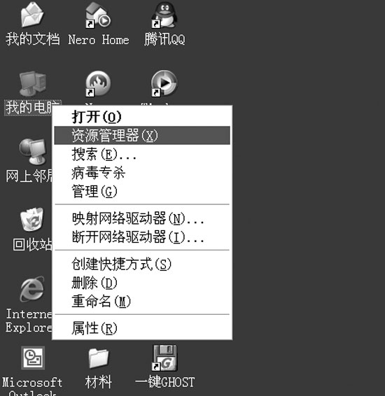 在“我的电脑”图标上右击鼠标,选择[资源管理器](如图1)。