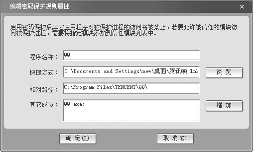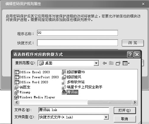 单击左下角的[增加规则]按钮。在“编辑密码保护规则属性”窗口的“程序名称”一栏中输入需要保护的程序名称,例如:“QQ”。然后单击[浏览]按钮,选择桌面上的QQ图标(如图2),这时瑞星将自动把快捷方式、相对路径等信息提取并添加到“编辑密码保护规则属性”窗口中。最后单击[确定]按钮完成添加(如图3)。