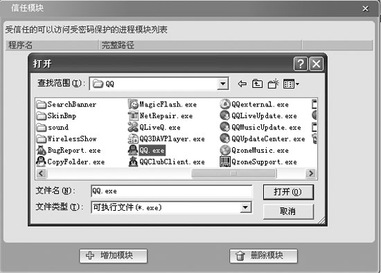 单击[信任模块]→[增加模块]按钮,选择QQ安装目录下的“QQ.exe”添加到“信任模块”中(如图4)。