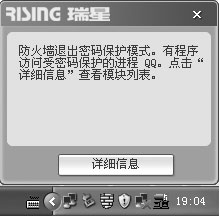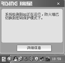 吼吼,现在一切搞定,一起看看“成果”吧!双击QQ后,你会发现瑞星个人防火墙从桌面右下角升起提示—防火墙进入“密码保护模式”(如图5)。此时,程序已经受到保护,你可以放心使用QQ聊天程序了,不必再担心密码被盗。