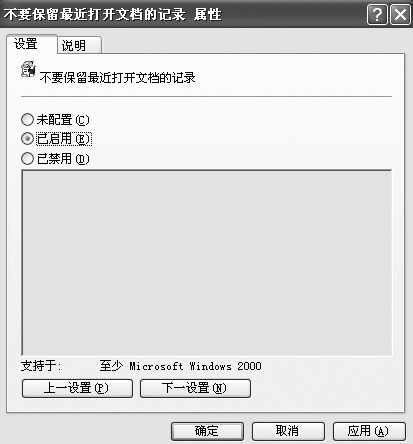 单击[开始]→[运行],在“打开”框中输入“gpedit.msc”,单击[确定]按钮打开“组策略”对话框,在左面的菜单中依次展开 用户配置→ 管理模板 → 任务栏和[开始]菜单,在右面的窗口中双击 不要保留最近打开文档的记录 ,在弹出的“不要保留最近打开文档的记录属性”对话框中选择“已启”项,最后单击[确定]按钮(如图3)。这样我们的“文档”中就不会再显示之前打开过的文件记录了。
