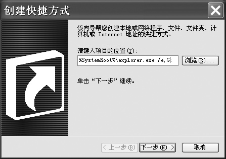步骤二:先将输入法切换到“美式键盘”,然后在“请键入项目的位置”栏内输入:“%SystemRoot%explorer.exe /e,G:”(“代码”收录在光盘“秘技偷偷报”中),输入完后单击[下一步](如图2)。