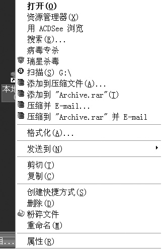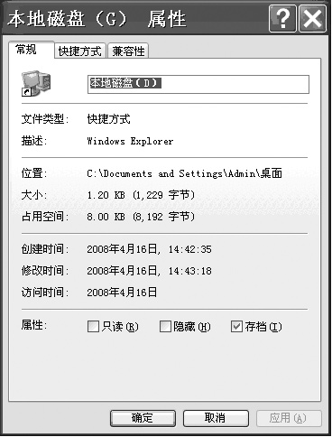 步骤一:右键单击“快捷方式”,在右键菜单中选择[属性](如图4),打开“本地磁盘(G)属性”对话框。