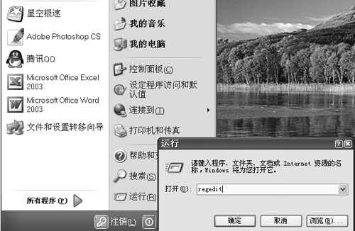 第一步:单击[开始]→[运行],在“运行”对话框中输入“regedit”(如图1)。