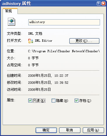 步骤2:右击“adhistory.xml”文件,选择[属性]。在弹出的对话框中选中“只读”属性(如图4)。