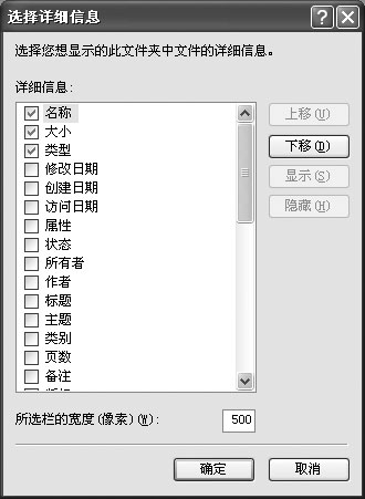 再单击菜单栏中的[查看]→[选择详细信息],打开“选择详细信息”对话框,选中里面的“名称”,然后单击右侧的[显示],在下边的“所选栏的宽度(像素)”后边的框中输入“500”,单击[确定]关闭对话框(如图4)。