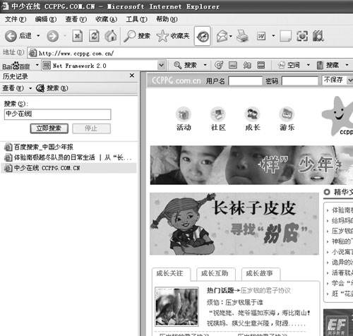 IE浏览器历史记录中提供了关键词搜索功能,大大提高了查找历史记录的效率。例如查找带有“中少在线”网页标题的地址时,只需在“历史记录”栏中单击[搜索],然后在“搜索”栏中输入关键词,再单击[立即搜索]即可(如图3)。