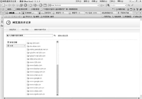 傲游浏览器历史记录的显示与查找方式更加人性化,速度也更加快捷。在快捷工具面板中单击[历史],进入傲游“浏览器历史记录”界面,在“浏览历史”框下按时间先后顺序记录了最近访问过的网址(如图4)。