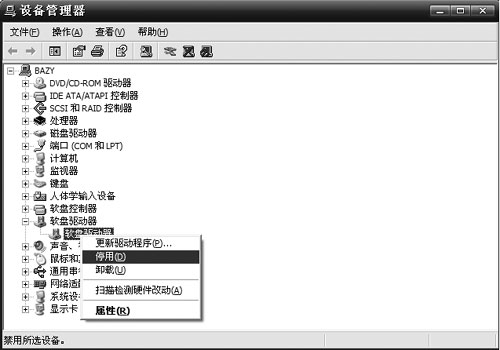 鼠标右键单击[软盘驱动器],选择[停用](如图4)。嘿嘿,淀粉们快去看看吧,“3.5软盘(A:)”已经消失不见了。