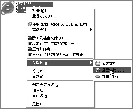 步骤1:打开“我的电脑”,找到IE的安装目录。右键单击“Iexplore.exe”文件,在弹出的快捷菜单中选择[发送到]→[桌面快捷方式](如图1),在桌面上建立一个“Iexplore.exe”文件的快捷方式。