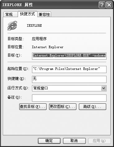 步骤2:右键单击该快捷方式,选择[属性],在弹出的“Iexplore.exe属性”对话框中单击[快捷方式],在“目标”处的最后加入参数“-nohome”,单击[确定](如图2)。