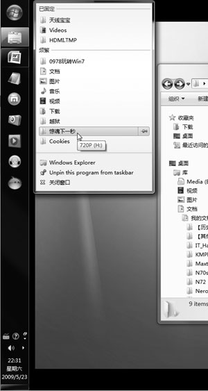 宽屏的电脑总是让人感觉上下的高度有些吃紧,我们可以把以往占用高度的任务栏竖起来,让它停靠在桌面的边缘。Windows7的开发人员显然也考虑到了这一点,他们让竖起来的任务栏看上去比横着时更舒服、更原装一些(如图6)。我保证,用几天之后,你绝对不想让任务栏再横起来了。