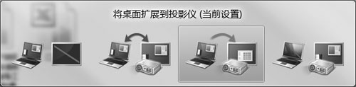 在Windows7系统里,对双显的设置也很简洁:利用Windows键+P组合键,可以快速地在“镜像显示”“扩展显示”“单一显示”几种模式中切换(如图9)。